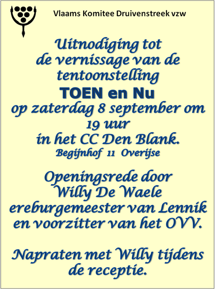 Op zaterdag 8 september 2018 vanaf 19u is er de vernissage van de tentoonstelling TOEN en NU in CC Den Blank. Gastspreker is Willy De Waele, oud-burgemeester van Lennik, politiek secretaris VVB en voorzitter OVV. De tentoonstelling TOEN en NU is te bezichtigen tot en met zondag 23 september tijdens de openingsuren van CC Den Blank.